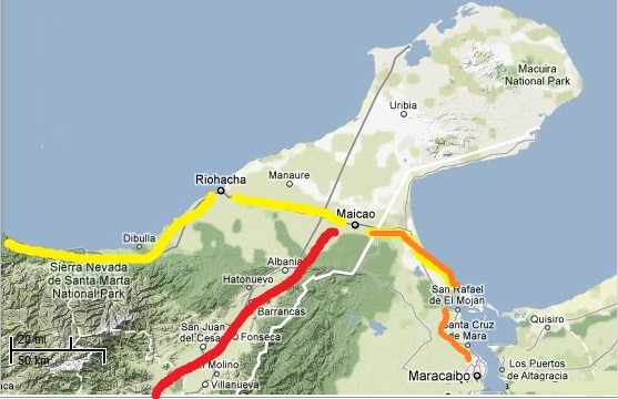It does not matter a great deal to Venezuela which route Colombia builds. It may well be of considerable utility to Colombia to consult with Ecuador and Peru. But ultimately Venezuela will have to build a link from Maicao to a new supurb near Maracaibo. Then Venezuela faces its first engineering choice - a tunnel under Lake Maracaibo, a bridge across the lake, or a southern loop that goes around the bottom of the lake.
