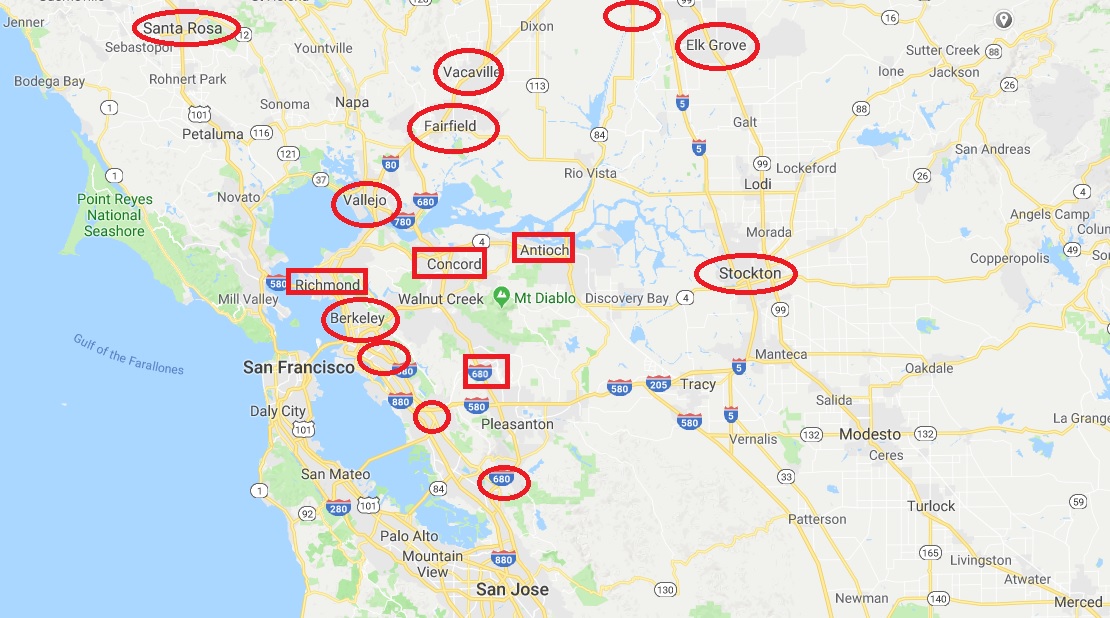 Berkeley, Fremont, Hayward and Oakland (population over 400,000) in Alameda County. Elk Grove and Sacramento (population over 400,000) in Sacramento County Fairfield, Vacaville and Vallejo in Solano County Roseville in Placer County Santa Rosa in Sonoma County Stockton (population over 300,000) in San Joaquin County |