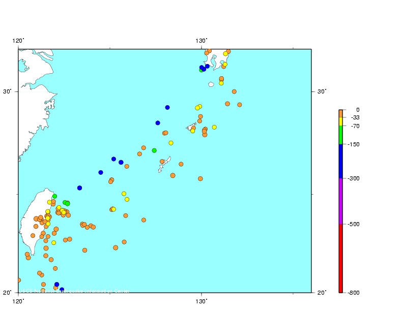 Richter 6.0 or higher events since 1973. Taiwan is at the lower left.