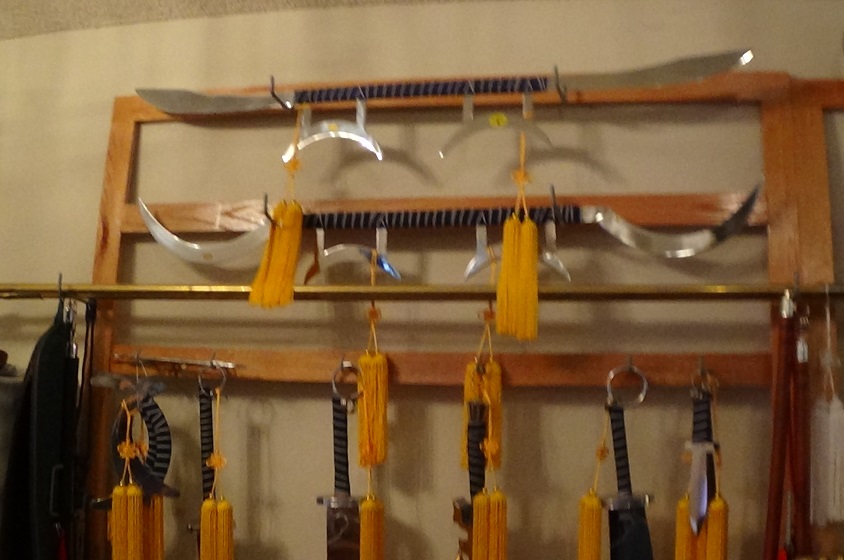 rack for exotic sabers and hybrid sword-spears. Visible are a