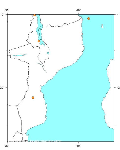 The only dot remaining inside Mozambique is from the Richter 7.0 event on 02/22 /2006. As far as we know, four people killed; 40 injured and about 200 buildings damaged. There was a substantially stronger (probably 7.6) event in 1900.