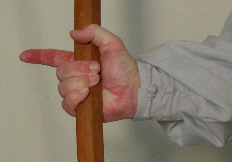 | When a sword is spun the forefinger has to get out of the way. Note that the bokken has a varying |