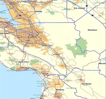 ![]() Santa Clara County is geographically very diverse with a highly urbanized concentration in the northwest, two outliers in the southeast (Morgan Hill and Gilroy), and large, sparsely populated areas around and in between. |