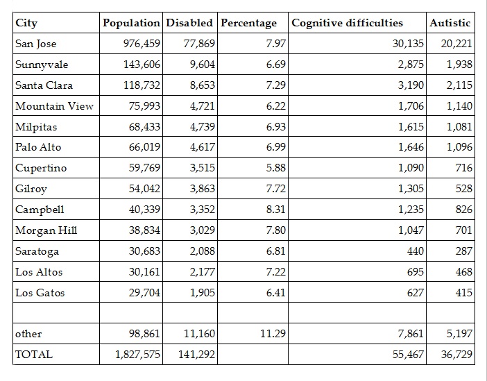Estimates for Santa Clara county by city for people with disabilities, cognitive difficulties and autism spectrum disabilities. It is reasonable to estimate that these tallies will be 50% higher if all disabilities of interest to us were included. |
