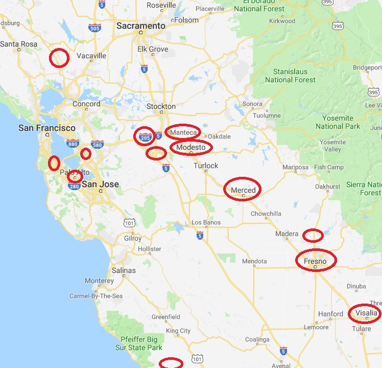 In more southerly locations Livermore and San Leandro in Alameda County Fresno (with a population of 515,986) and Clovis in Fresno County Merced in Merced County Napa in Napa County Manteca and Tracy in San Joaquin County Redwood City in San Mateo County Mountain View in Santa Clara County Modesto (population over 200,000) in Stanislaus County Visalia in Tulare County |
