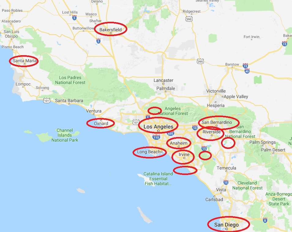 In this phase the focus is on larger cities in southern California. Los Angeles with a population of nearly four million people would be expected to dominate Bakersfield (population over 300,000) in Kern County. Glendale, Long Beach (population over 400,000), Los Angeles (population almost 4,000,000) in Los Angeles County Anaheim (population over 300,000), Huntington Beach, Irvine, Santa Ana (population over 300,000) in Orange County. Moreno, Riverside (population over 300,000) in Riverside County Fontana, San Bernardino in San Bernardino County Chula Vista, San Diego (population almost 1,400,000) in San Diego County Santa Maria in Santa Barbara County Oxnard in Venture County |