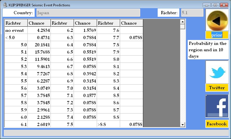 | For Japan. Even fairly advanced countries that are aware of the danger of earthquakes and tsunamis (and, in Japan's case with dozens of potentially dangerous volcanoes) the ability to use sirens, e-mails, cell phones or traditional mass media such as radio or television is still limited. Accordingly, we advocate social networking channels such as Twitter and Facebook as supplementary means of communicating both a looming emergency as well as a way to get help after a disaster. Even though the hundreds of earthquakes (three large clusters) east of Honshu but well west of the Pacific Plate boundary in only a few days were unprecedented and still lack adequate explanation, our models are doing fairly well at prediction. See the Chronology topics for more details. |