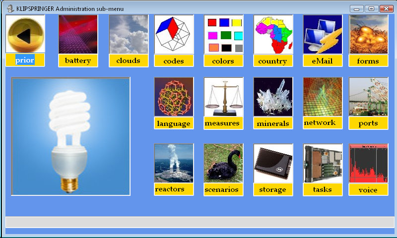 | KLIPSPRINGER administrative functions - users can change colors, country and sub-country,, fonts, language, and voice for text to speech. We also provide the ability to check battery status, cloud connections, network availability, secondary storage (tuning of Solid State drives is often very worthwhile) and processor usage. In this configuration enabled fields (can be clicked or in some cases typed into) are in gold; labels are white and read-only fields are gray. The most -used choices are measures, minerals and scenarios, while reactors and ports are typically used once when scenarios are being defined. |
