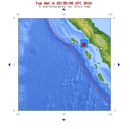 the 5.1 aftershock (red square - at 2.270 N 97.077 E 35.0 km deep at 22:54). Nias Island is where I