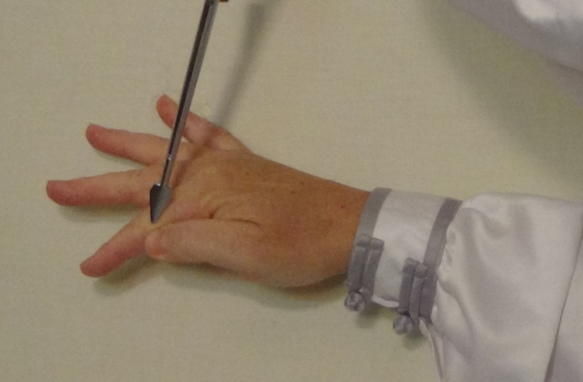 | perpendicular to your forearm bones with the index finger at the elbow you should feel some muscular tension beneath |