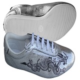 When wearing a semi-formal black cotton or formal silks for tai chi chuan and other Chinese arts, another option is to wear one of the styles of shoes shown below. For the most part, the plain black shoes do NOT photograph as well as the whites. Probably something to be said for silver, gold and other exotic colors. We are not certain how long silver shoes look good or what to do about scuffs on white shoes. |