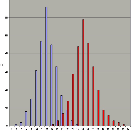 | In this case, the dimension of time flows from left to right, suggesting that if there is any correlation between the blue events and the red events, blue must cause red. A straight rho (product-moment) correlation gives an r of -.356 but when covariance in effect shifts the blue bars to the right there is such a high correlation that even a jaded statistician would concede causality. Readers will find Bradley E. Huitema's (professor of psychology at Western Michigan University) book Analysis of Covariance and Alternatives (Wiley, New York, 1980) instructive. ISBN: 0471420441 : 9780471420446 - Professor Huitema told us a new edition was coming in January 2009. Made it in October 2011. $125 in hardcover; $80 on Nook. |