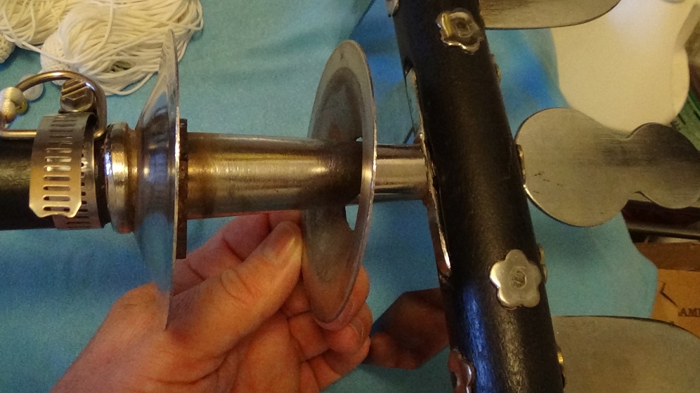 | Fifth, my fancy rake has a 10 inch long spearhead (the attaching collar is four inches long and the blade is six inches long) on the bottom tip. The rake used in the recording had just a simple wooden shaft which seems much safer to me. I have included a close-up image of the mysterious cymbal feature in an open or separated position. We have called the feature a 'noisemaker' or sometimes a 'clacker'. Several forks include this. |