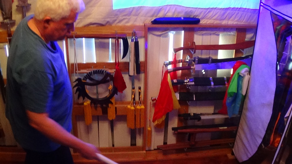 | The right hand half of the wide but short rack with (from the left) kama and nunchakus (padded), wind fire wheels, sai (gen in Chinese), a case containing Prochux, four sabers and a double saber, four tonfas and two bokkens. Part of the closet for storing uniforms can be seen at the far right. The cyan colored strip at the top right is the projector warming up - the curtain has not been dropped down yet. |