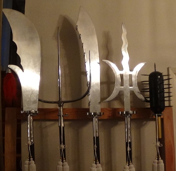 | One of the long weapons racks. From the left: green dragon kwan dao, trident, nine ring pu dao, double crescent snake halberd, and the wolf teeth mace. |